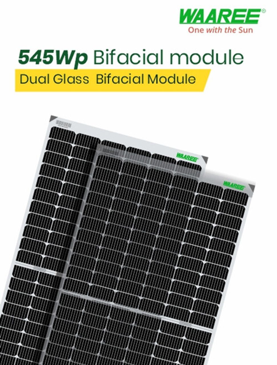 WAAREE 545Wp 144Cells 24 Volts Framed Dual Glass Mono PERC Bifacial Solar Module – (DCR)